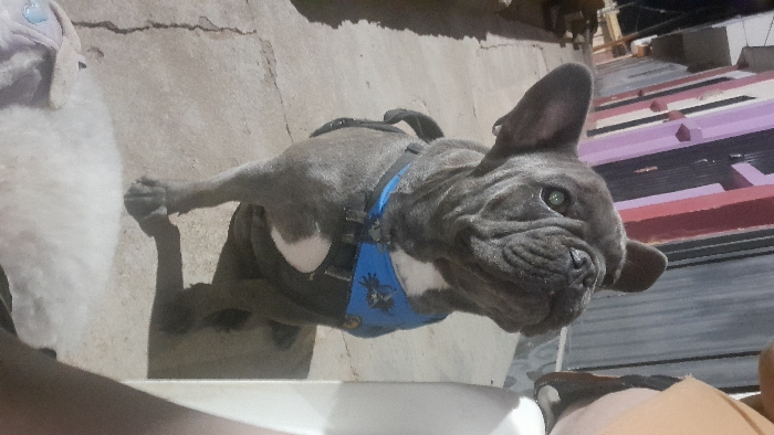The scene is set on a cracked concrete pavement within a residential area in Timaná, Colombia, likely during dusk or nighttime, illuminated by artificial light. The primary subject is a gray French Bulldog, positioned centrally, sitting on its haunches with its front paws together. The dog possesses distinct erect ears, a wrinkled muzzle, and light green eyes, which are directed upwards and slightly to the viewer's right. A white patch is visible on its chest, and it wears a black harness with a blue bandana featuring a dark, stylized pattern around its neck. To the lower left, partially visible, is a white, fluffy object, potentially a toy or a small white dog, lying on the pavement. On the right side of the frame, a person's light-skinned forearm and hand are partially visible, clad in a beige garment, positioned near a white, possibly plastic, object or piece of furniture. The French Bulldog appears to be looking up towards this person or an unseen entity. The background consists of architectural elements, including sections of building facades painted in alternating reddish-brown and pink/purple hues, with darker grey sections also present, suggesting multiple adjacent structures lining a street or alleyway.