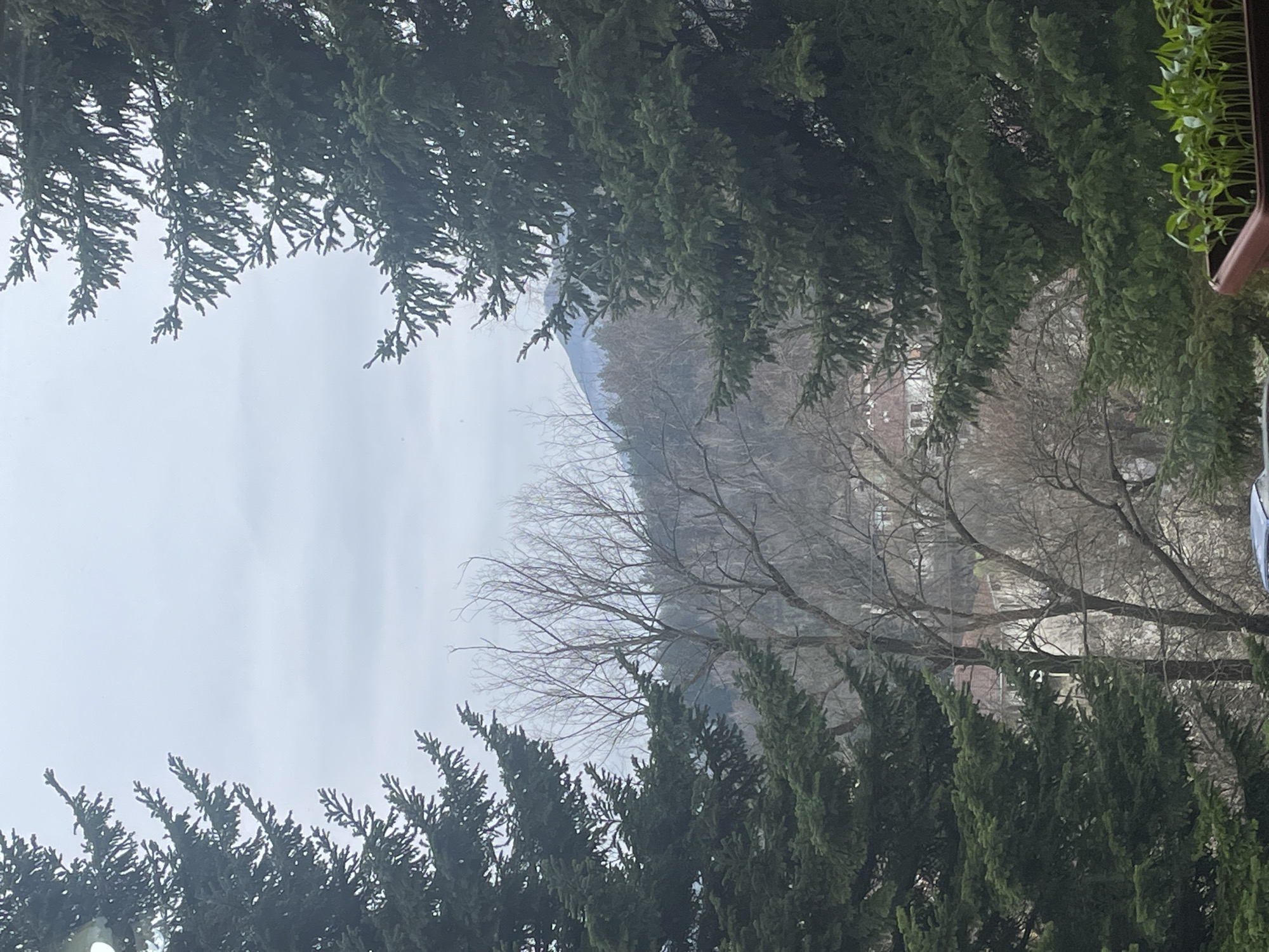 - "The image depicts a view through the dense foliage of evergreen trees, framing a landscape with bare deciduous trees and indistinct structures" by FM-Db9Ci2, licensed under CC BY 4.0