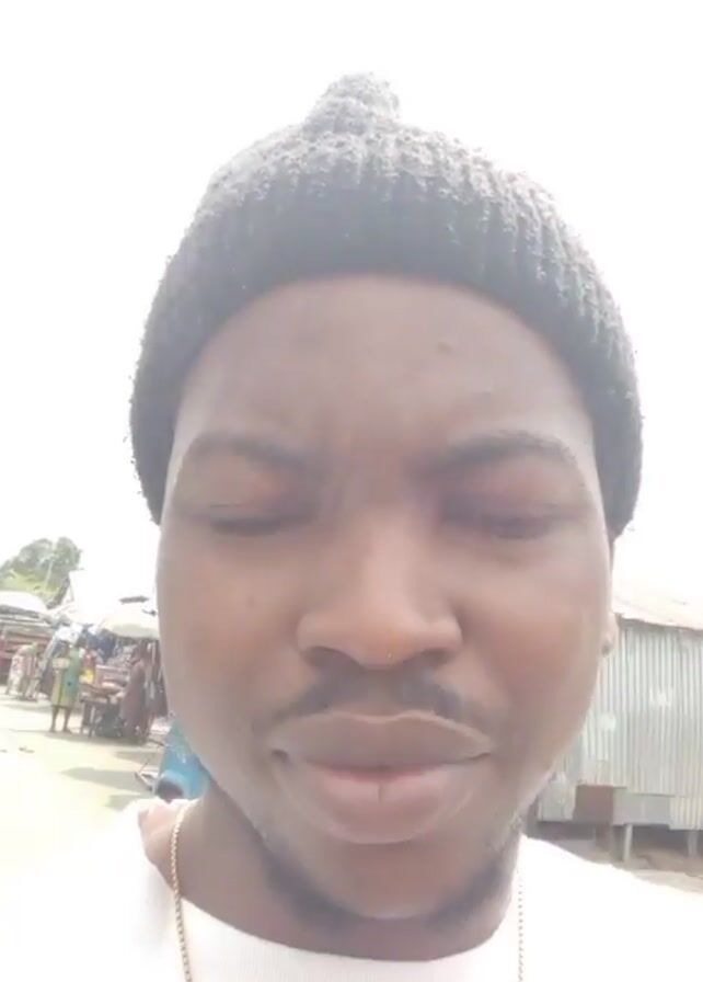 A man with dark skin and a black beanie is the focus of the video. He has a short beard, and is wearing a white t-shirt with a gold chain. He touches his forehead with his right hand, then looks up. He is standing near a road with traffic, including cars, trucks, and some motorized tricycles. There are some people walking by, and some buildings in the background. The sky is overcast. The man is likely holding a mobile phone to record the video.