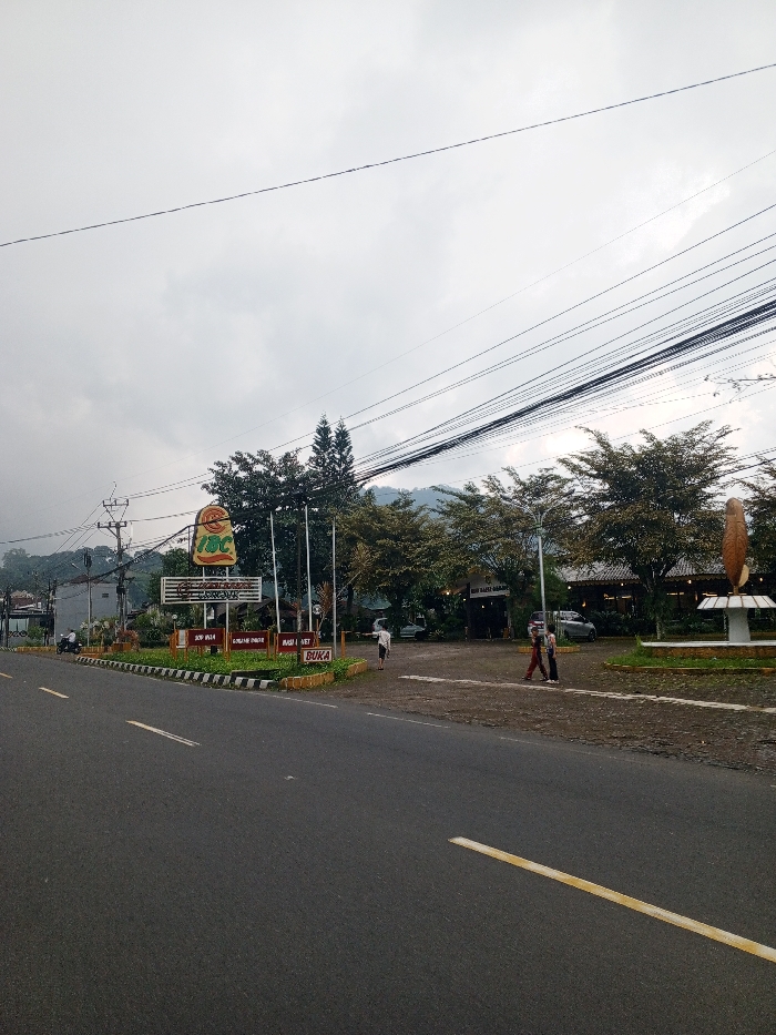 The image depicts an exterior view of a roadside establishment, identifiable as a restaurant, under an overcast sky. The scene is characterized by an asphalt road with a yellow center line on the left, bordering a landscaped median strip. This median features green foliage and several small signs with red backgrounds, displaying white Indonesian text such as "BUKA" (Open). To the right of the median, the establishment's entrance is marked by a prominent, large sign with "IBC" in yellow lettering on a green, fish-shaped background, and smaller text beneath indicating "IKAN BAKAR CIANJUR" and "GURAME BAKAR." These signs, along with other visible Indonesian words, indicate the location is in Indonesia. Several power lines and utility poles are visible on the left side and extend across the upper portion of the frame. Beyond the signage, a dirt or gravel parking area extends, where two cars (a silver sedan and a white SUV) are parked near single-story buildings with dark roofs, presumably the restaurant structures. Multiple individuals are present: one person in a light shirt walks from left to right near the main entrance, while two other individuals (one in a red shirt, one in a dark shirt) walk across the parking area from right to left. A person on a white scooter is partially visible further down the road on the far left. To the far right, a large, golden, fish-shaped sculpture stands on a white pedestal within a grassy area. The background features densely vegetated hills or mountains beneath a light gray, cloudy sky.