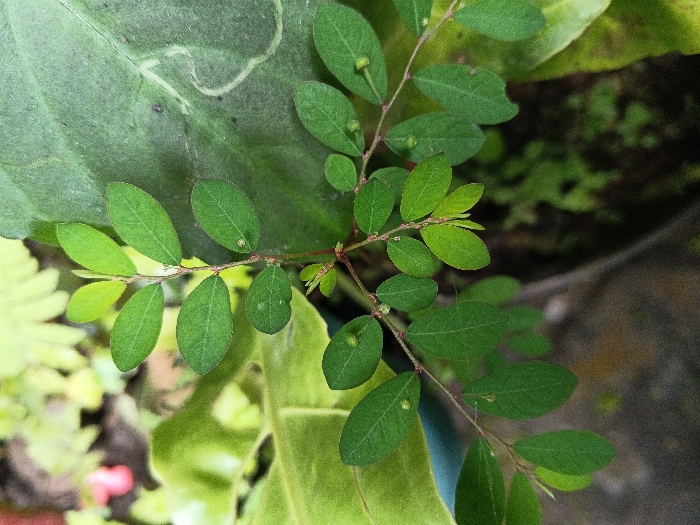 A plant with small, rounded green leaves grows alongside larger foliage. The tiny leaves are arranged symmetrically along thin reddish-brown stems. Small, round structures are seen near the base of each leaf. A portion of a large, smooth green leaf is visible in the background, featuring a pale marking. Other plants with different textures and shades of green fill the periphery. The ground or container surface is vaguely visible with a mix of earthy tones.