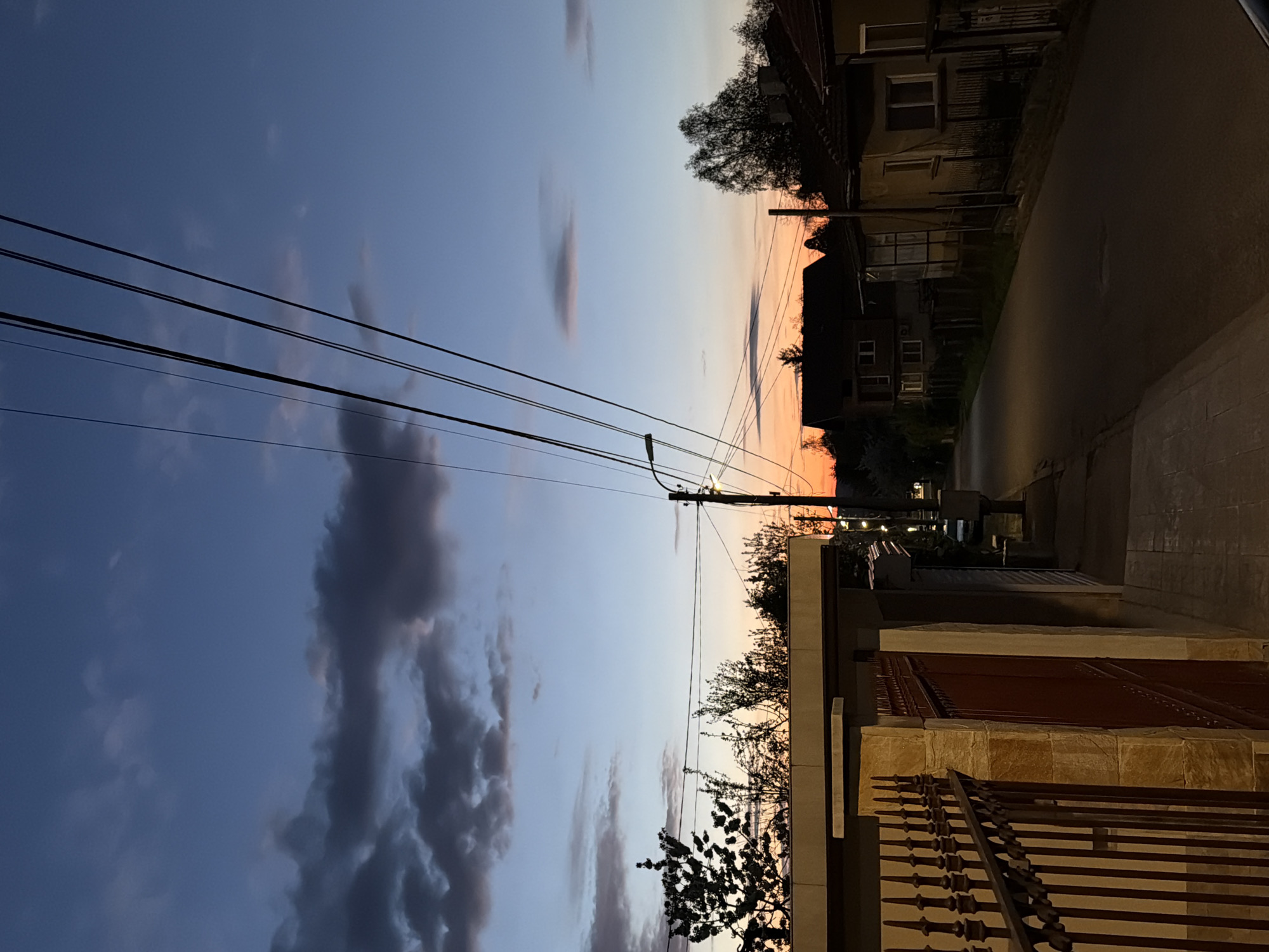 The image depicts a street scene in Berkovitsa, Bulgaria, taken during twilight. The sky displays a gradient of colors, transitioning from blue with grey clouds on the left to orange and pink hues on the horizon. Electrical wires stretch across the sky from left to right. A street lamp stands in the middle of the frame. On the right side of the image, buildings line the street, their details obscured by shadows. The street itself is paved and appears damp, reflecting the ambient light. A sidewalk is visible along the right edge, bordered by a fence. The foreground features a building with a fence and wooden gates. There are trees with bare branches scattered along the horizon.
