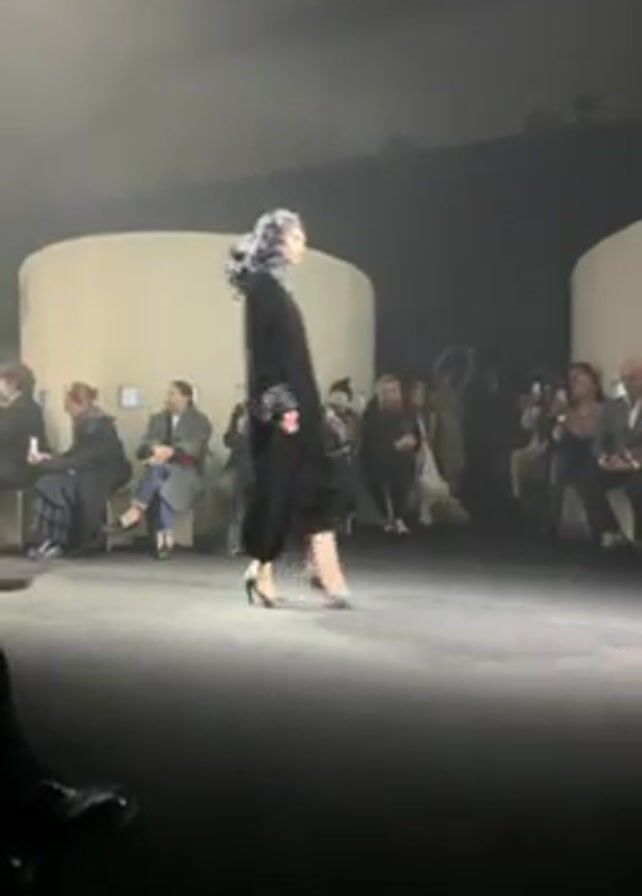 fashion show with three models walking down a runway. The first model wears a long, black dress and tan heels. The second model wears a long, white dress with a large, floral headdress. The third model wears a bright pink dress. There are people sitting on either side of the runway, watching the show. Some of them are taking photos with their phones. The runway is black and the lighting is dim with some spotlights on the models. There are three large, white circular structures in the background.