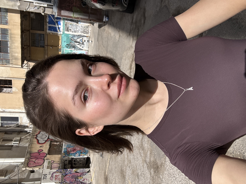 The image depicts a female individual, approximately 20-30 years old, with light brown hair and light-colored eyes, engaged in a self-portrait in an urban alleyway. She is wearing a dark brown, short-sleeved top and a thin silver chain necklace with a small capital 'A' pendant. The subject is illuminated by direct sunlight, casting subtle shadows on her right side. The background consists of multi-story, light-beige colored buildings characteristic of older architecture in Tel-Aviv, Israel. The walls are extensively covered in various graffiti, including pink bubble letters, cartoonish figures (such as an octopus-like creature, a pig-faced character, and a rabbit-like silhouette), and text. A white sign with the number "706" and some Hebrew script is visible on a wall to the left. The ground is an uneven, light-colored paved surface. A portion of a dark-colored vehicle is visible parked on the far right. The scene's overall aesthetic, including the older buildings, extensive street art, and urban alley, is consistent with areas like the Florentin neighborhood in South Tel-Aviv.