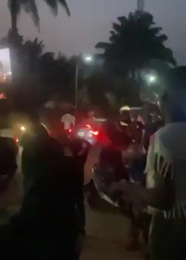 At dusk, a crowd gathers near a street illuminated by streetlights and car headlights. People hold up their phones, possibly recording an event, as they stand near vehicles including motorcycles and what appears to be an auto rickshaw. Silhouetted palm trees are visible against the sky. Some individuals are moving around, while others remain relatively still.