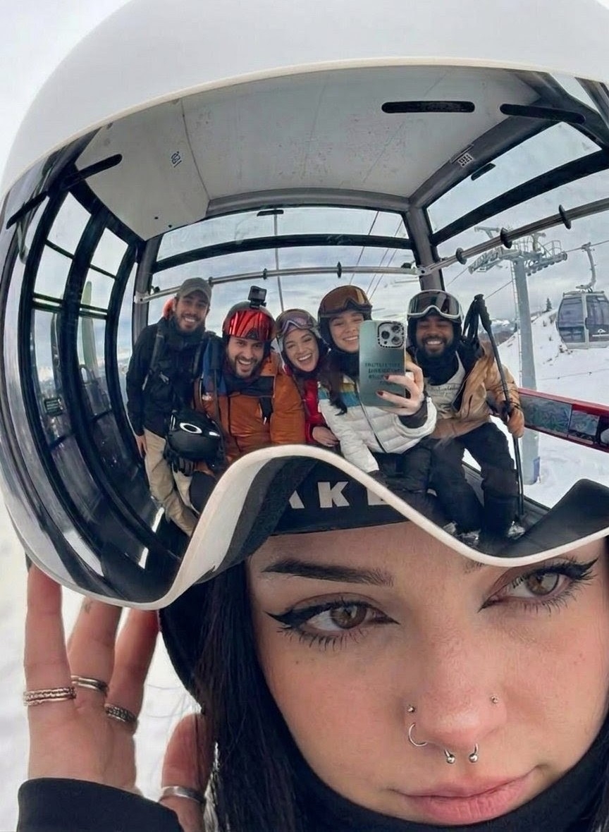 A selfie reflects in the visor of a white ski helmet. The face of a young woman wearing the helmet is in the foreground. She has brown eyes, fair skin, dark hair, and multiple piercings in her nose. Her fingers are visible, adorned with several rings. The reflection within the visor depicts a group of five people inside a ski lift gondola. They are all dressed in winter attire. The gondola car's windows show a snowy landscape with a ski lift tower and other gondola cars visible. The location is identified as the city of Bistritsa, Bulgaria.