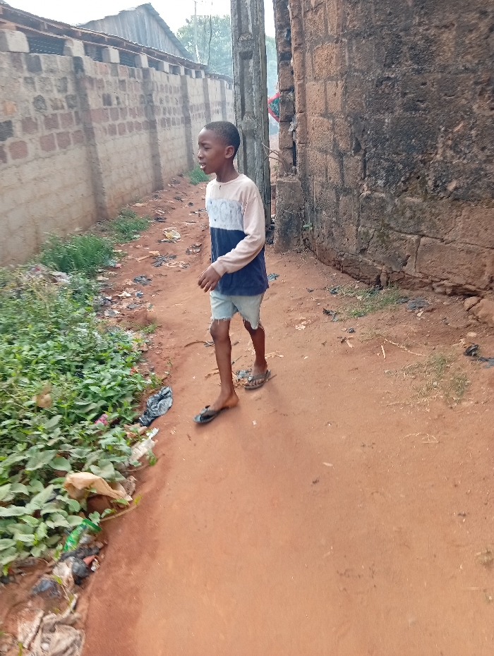 A young male subject, approximately 8-12 years old, with short dark hair and light skin, is depicted walking on a reddish-brown dirt path. He wears a long-sleeved shirt, light beige on top and dark blue on the bottom, with light-colored ripped denim shorts and dark flip-flops. His body is oriented towards the right, with his head turned slightly to the right, mouth slightly open. To the subject's left is a low concrete block wall topped with a fence structure, beyond which green vegetation and a corrugated metal roof are visible. The base of this wall features an accumulation of green leafy plants and various discarded items including plastic bags and wrappers. To the subject's right is a tall, aged, dark brown brick wall, showing signs of weathering and deterioration. A weathered utility pole or column stands in front of this brick wall. The path itself is uneven with scattered small debris. The scene occurs outdoors in the city of Unknown, Unknown.