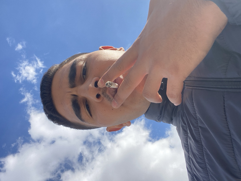 young adult male in Dahiyat Harasta, Syria, captured from a low-angle perspective against a bright blue sky with scattered white cumulus clouds. He is wearing a black quilted puffer jacket. His right hand holds a lit cigarette, with visible ash at the tip, positioned in front of his mouth. The individual's gaze is directed towards the camera. The scene is outdoors under clear daylight conditions.