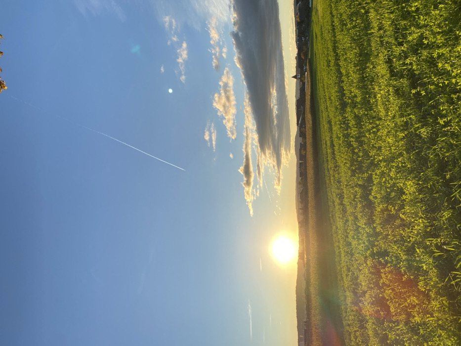 The image displays an outdoor landscape scene captured at sunset in Glattbrugg, Switzerland. The foreground is dominated by an expansive field of low-lying green vegetation, intensely illuminated by direct, low-angle sunlight, creating bright yellow-green tones and a lens flare effect in the lower-left. In the mid-ground, a settlement is visible, comprising various buildings and a prominent church spire with a reddish roof located on the right side. Distant hills form the background horizon. The sky, occupying the upper half of the frame, is predominantly clear blue with scattered cumulus clouds, showing golden and white illumination from the setting sun. A distinct white contrail from an aircraft traverses the sky diagonally from the upper right to the mid-left. The sun, a brilliant circular orb, is positioned low on the left horizon, casting a strong golden glow across the scene and causing a secondary lens flare in the upper-right quadrant. No individuals or active subjects are present.