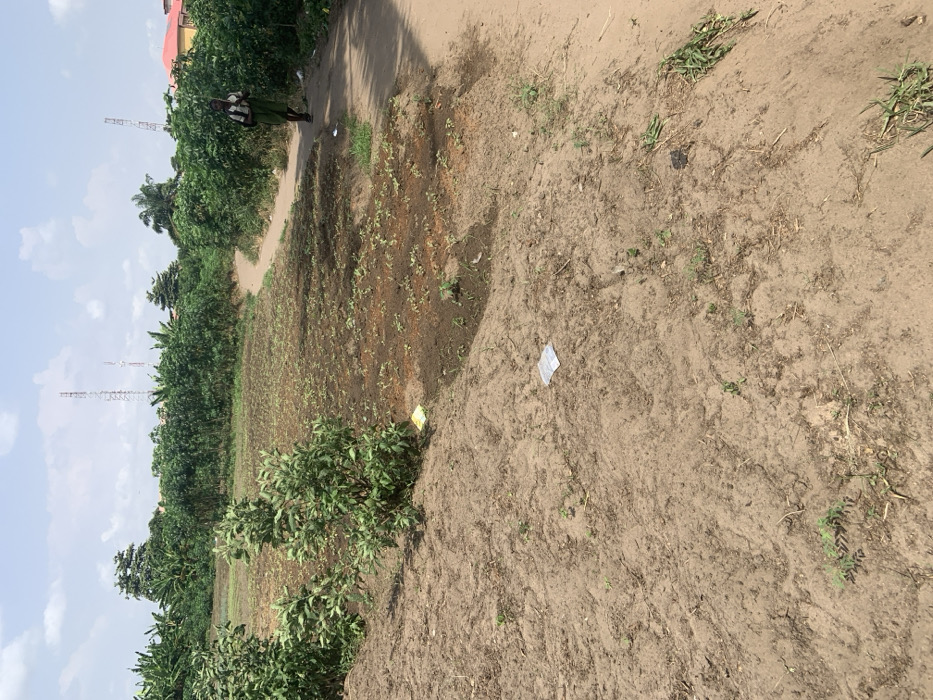 This image depicts an outdoor scene in Ijanikin, Nigeria, under a bright, partly cloudy sky. The foreground consists of dry, light-brown soil with scattered small green plants and two pieces of litter: a white wrapper and a yellow wrapper. Moving into the midground, a cultivated field is visible, containing numerous rows of young, green crops planted in darker soil patches. To the left of this field are two small, leafy green trees. A winding, light-brown dirt path runs along the right side of the field, extending from the midground towards the background. One individual is present on the dirt path in the mid-right, walking away from the camera. This person appears to be wearing a school uniform, consisting of a light-colored shirt and dark green trousers or skirt, with a backpack visible on their shoulders. The background is characterized by dense green vegetation, including larger trees, banana plants, and what appear to be cassava plants, forming a natural barrier. Above the tree line, multiple tall, metallic lattice communication towers are visible, along with a partial view of a building featuring a red roof on the far right. The overall environment suggests a semi-rural or agricultural area bordering a developed section of the city.