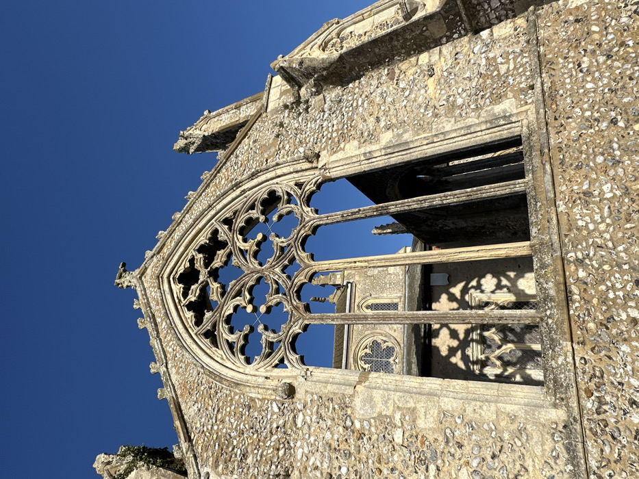 An exterior, low-angle photograph captures the weathered ruins of a large medieval church, framing a smaller, active church building against a clear, deep blue sky. The foreground features a substantial wall, constructed primarily from irregular grey flint interspersed with lighter, yellowish-brown cut stone, particularly evident in the quoins and structural elements. Dominating the wall is a prominent, pointed-arch (Gothic) window opening. Its intricate, eroded stone tracery, consistent with Perpendicular Gothic style, forms delicate curvilinear and quatrefoil patterns in the upper section and vertical mullions below. The window lacks glass, revealing the background. The upper edges of the ruin are irregular and broken, showing signs of advanced erosion and minor vegetation growth. Through the open window of the ruin, a more intact, lighter-colored stone church building is visible in the midground. This structure features a distinct circular (rose) window with tracery and an arched, narrower window positioned to its left. The active church appears to be in good repair compared to the foreground ruin. Sunlight, likely from the left, illuminates the scene, casting sharp, ornate shadows of the ruined window's tracery onto the lighter wall of the background church. The overall environment is one of historical architecture under bright, cloudless daytime conditions. No people or active interactions are depicted. The scene is located in the city of North Norfolk, United Kingdom.