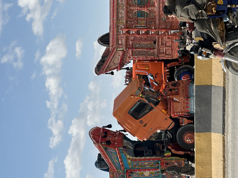 This image captures a daylight scene in Kuchlak, Pakistan, under a partly cloudy blue sky. Two elaborately decorated Pakistani trucks, showcasing traditional "truck art," are prominent. The truck on the left has its orange cab tilted upwards, exposing the engine compartment. Its visible bodywork is adorned with intricate patterns in blue, green, and red, featuring mirrors and hanging tassels. A man in dark traditional attire stands near the front left wheel of this truck, facing left. The truck on the right, primarily red and orange, also exhibits extensive decorative details, including a high, curved superstructure over its cargo bed. In the lower right foreground, a partially visible silver motorcycle with red suspension is being ridden by a person heavily cloaked in a brown garment. A concrete road barrier, painted yellow, gray, and black, runs horizontally across the mid-ground, separating the motorcycle from the trucks.
