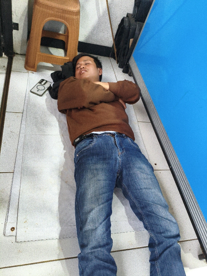 An adult male is observed lying supine on a light-colored tiled floor within an indoor setting in Bogor, Indonesia. He is wearing a brown long-sleeved shirt, blue jeans, and a dark belt, with a white undershirt visible at the waist. His arms are crossed over his chest, and his eyes are partially closed, suggesting rest or sleep. A black fabric item, possibly a jacket or bag, serves as a makeshift pillow under his head. To his left, near his head, a light-colored smartphone with a distinctive case featuring a circular design is visible on the floor. Behind him, against a light wall, a brown plastic stool is positioned. To his right, a large rectangular object with a bright blue surface and a metallic frame is visible, possibly a display board or part of a backdrop. The floor consists of light grey or off-white tiles, some of which appear covered by a lighter, possibly white, fabric or tarp. A dark, thin linear object, possibly a cable or rod, extends from the upper left foreground towards the background.