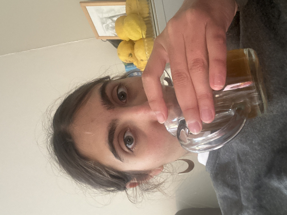The image presents a close-up, eye-level view of a female individual looking directly at the camera. She has dark hair, pronounced eyebrows, and light-colored eyes. She is wearing a grey top over a white collar and a crescent-shaped earring on her visible left ear. Her right hand, with natural nails, grasps a clear glass mug containing a brownish-yellow liquid, which she is drinking. The lower part of her face is obscured by the mug. In the background, against a light-colored wall, a collection of yellow lemons rests in a clear plastic dish. Behind the lemons, a framed picture or sketch with a light wooden frame is visible. A faint blue object is also partially discernible behind the lemons. The scene is an indoor, domestic setting in Pardes Hana-Karkur, Israel.