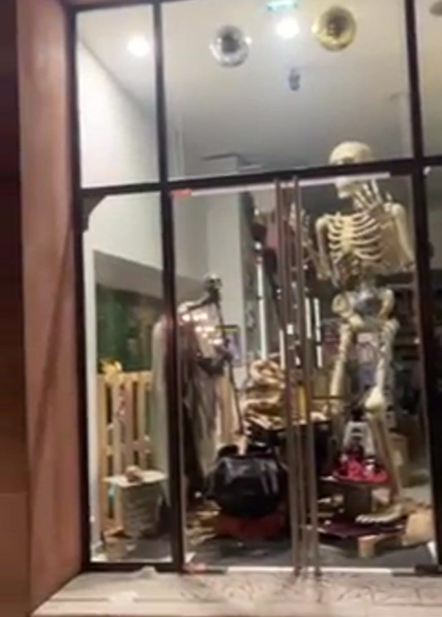 exterior of a shop called "Juice Shop" decorated for Halloween. The shop windows display various Halloween decorations including skeletons and other spooky props. Outside the shop, there are several tables and chairs, suggesting it is also a cafe or restaurant. The video is taken at night and the shop is well-lit, standing out in the dim surroundings. The buildings surrounding the shop suggest a European urban setting.