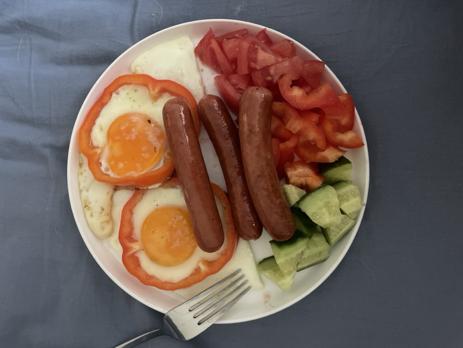 A white circular plate, presented in a top-down view, displays a meal set on a dark gray, textured surface in the city of Kommunarka, Russia. The plate contains two fried eggs, each cooked within a ring of red bell pepper, forming a heart-like shape with prominent orange yolks. Three brown, cooked sausages are arranged diagonally across the center of the plate. To the right, a portion of roughly chopped red tomatoes is visible. To the bottom left, a section of roughly chopped green cucumbers is present. A silver-colored metal fork rests on the left side of the plate. No individuals are visible in the scene.