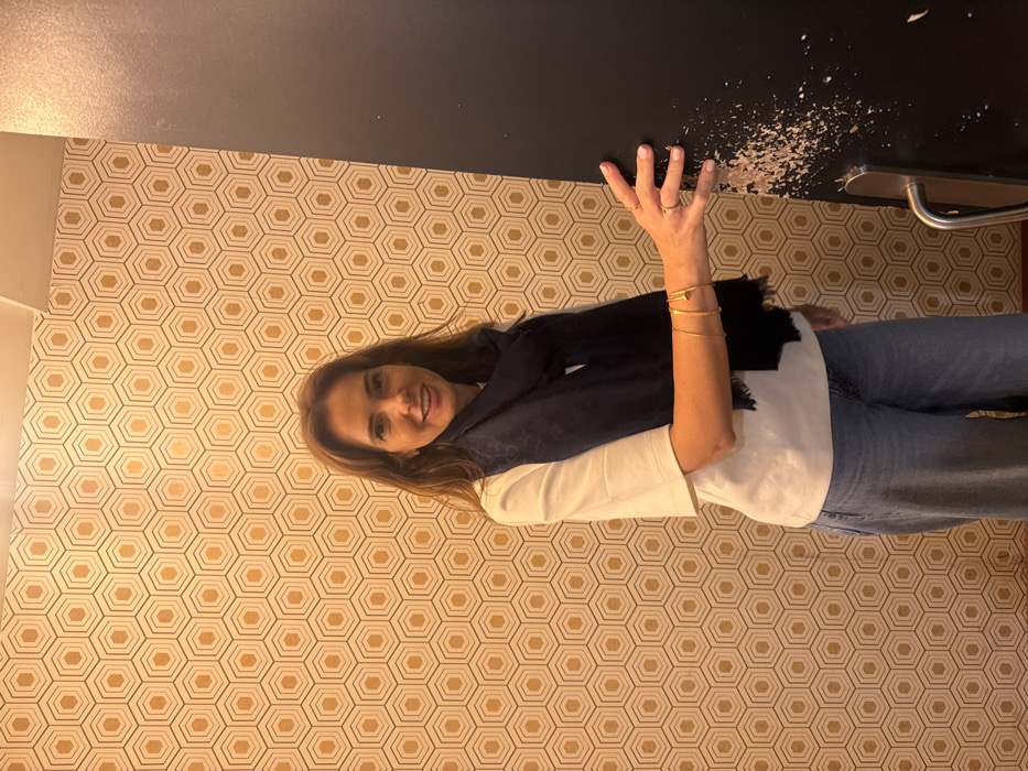 An indoor photograph from Villeurbanne, France, features a single adult female standing in a room or hallway. The woman smiles directly at the camera. She has medium-brown hair and is dressed in a light-colored, short-sleeved top, light blue wide-leg jeans, and a dark blue scarf draped around her neck. On her right wrist, she wears several thin gold-toned bracelets, including one with a distinct nail-head design, and a ring on her right ring finger. Her right hand is gently placed against a dark, matte vertical surface, likely a door or wall panel, on the right side of the frame. This dark surface exhibits a significant accumulation of light-colored, chipped material or residue, possibly plaster or paint, concentrated around the area her hand touches. A metallic door handle is visible on the lower right portion of this dark surface. The background wall behind the woman is covered in wallpaper featuring a repeating hexagonal pattern in shades of beige and gold.