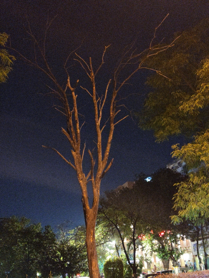 The image depicts a nighttime urban scene in Islamabad, Pakistan. A tall, slender deciduous tree, largely bare of leaves, stands centrally, its amber-brown trunk and stark branches illuminated against a dark, noisy blue-black sky. To the upper right, a portion of a tree with green foliage is visible. In the midground and background on the right side, a multi-story building with visible windows or balconies and a prominent blue light source is present. Below this building, an illuminated public area, possibly a street or market, contains smaller trees, shrubs, and various artificial lights, including streetlights and scattered red and white decorative lights. Several indistinct human figures are visible in this brightly lit background area, appearing to walk or stand. The overall environment is an urban park or streetscape adjacent to developed infrastructure, illuminated by artificial light sources causing noticeable image grain.
