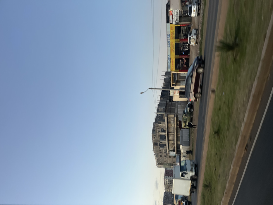 A rotated view shows a cityscape under a clear blue sky. Buildings of varying heights line a roadside. Vehicles, including cars and trucks, occupy the road next to a grassy strip. A building labeled "YOKOHAMA CENTRE" is visible. The scene appears to be taken from a slightly elevated position.