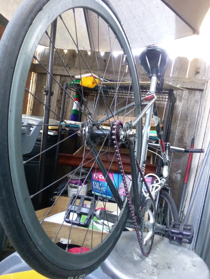 - "In the city of Los Angeles, United States, an upright fixed-gear bicycle with a silver frame, black saddle, and dark red chain is positioned with its rear wheel resting on a light-colored, possibly metal, stool" by FM-Hjusx2, licensed under CC BY 4.0
