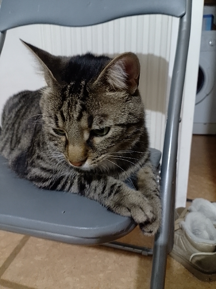 - "A tabby cat rests on a gray folding chair" by FM-5n8Vg2, licensed under CC BY 4.0