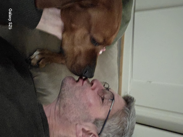 - "A brown dog with a white paw resting on a tan sofa nuzzles the face of a gray-haired man wearing glasses" by FM-sTzIG3, licensed under CC BY 4.0