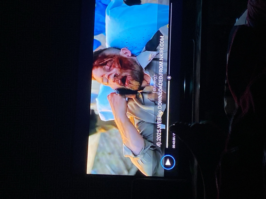 The image displays a television screen in a dimly lit environment, likely indoors during low light conditions. The television screen occupies the central and lower portions of the frame. On the television, a close-up of a male individual is visible. He has short hair and a beard, and his face is visibly bloody, particularly around his left eye, cheek, and mouth, indicating injury. His mouth is open, and his eyes appear partially closed. He is wearing a light tan or olive-colored uniform shirt with visible epaulets on the shoulders. His right arm is raised, holding a dark-colored cellular phone to his right ear, suggesting he is engaged in a phone conversation. He is resting against a light blue pillow or cushion. The background within the television display is out of focus, showing blurred light brown and blue elements. Overlaid on the video content are digital playback controls: a circular play icon on the lower left, a progress bar, and a timestamp displaying "00:42:30". Below the video, a text overlay states "I).2025.WEBRip.DOWNLOADED.FROM.NKIRI.COM". Above this, the word "(slurring):" is visible in parentheses. In the foreground, below the television screen, a silhouetted human foot or hand, covered by a dark reddish-brown blanket or fabric, is partially visible. The image contains no visual elements (e.g., landmarks, distinct architecture, geographic features) that forensically identify a specific location within the city of Jos, Nigeria. The on-screen text "DOWNLOADED.FROM.NKIRI.COM" indicates the content's source as a Nigerian media platform, suggesting a connection to Nigeria, but does not specify the viewer's physical location as Jos.