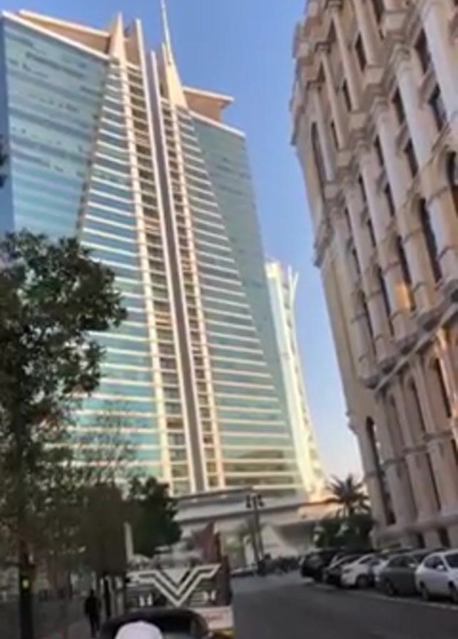 The video presents a low-angle perspective of a street scene with two contrasting architectural styles. On the left is a modern, glass-clad skyscraper with a unique triangular shape and a distinctive spire. The building reflects the blue sky, and the facade is segmented by horizontal lines. Adjacent to it on the right stands a building of classical European design, featuring ornate details, arched windows, and a light-colored stone or stucco exterior. The street in the foreground includes parked cars and a vehicle with a distinctive "V" shaped design on its hood. A few people can be seen walking in the background. A tree is present in the left foreground, partially obscuring the base of the skyscraper. The scene is bathed in natural light, suggesting it is daytime.