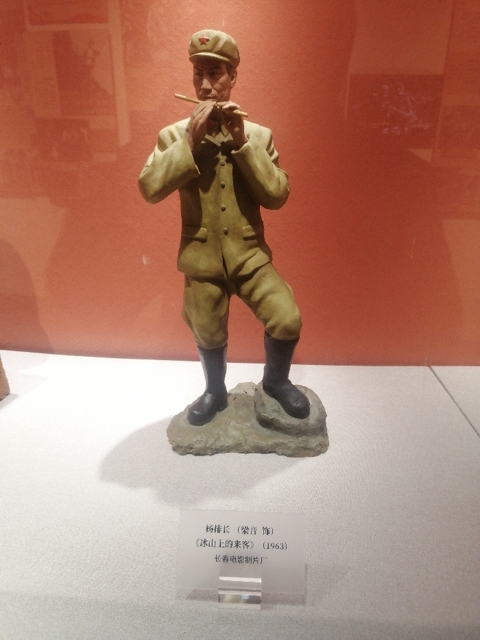 The image displays a ceramic or painted resin figurine of a male figure, located within an exhibition space in Fengtai District, China. The figurine stands approximately 30-40 cm tall, depicting a man in a military-style uniform. He wears an olive-green peaked cap adorned with a red star insignia, a matching olive-green jacket with multiple buttons, trousers, and dark, knee-high boots. The figure is posed with his hands raised to his mouth, holding and appearing to play a light-colored, slender flute or pipe. His facial expression is focused. The figurine stands on a textured, grey, rock-like base. It is positioned on a flat, light-colored surface, possibly a display shelf or table, which casts a soft shadow to its left. Behind the figurine is a plain, solid reddish-brown wall or background. Faint reflections, possibly from overhead lighting or distant display elements, are visible on this background. In front of the figurine, centered beneath it, is a clear rectangular display plaque with black Chinese characters. The text identifies the subject: "杨排长 (梁音 饰)" (Company Commander Yang, played by Liang Yin), "《冰山上的来客》 (1963)" (A Guest on the Icy Mountain, 1963), and "长春电影制片厂" (Changchun Film Studio). This indicates the figurine represents a character from a 1963 Chinese film produced by Changchun Film Studio.