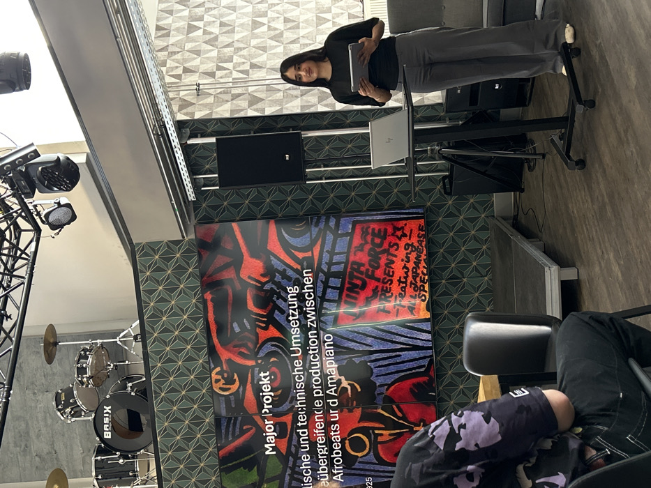 An indoor event space in Bochum, Germany, is depicted with a presentation in progress. A female individual with dark hair, wearing a dark short-sleeved top and grey trousers, stands upright to the right of a large multi-panel display, holding a grey tablet device in both hands. Her gaze is directed towards the left side of the room. The large screen displays vibrant, stylized graphic art depicting hands on turntables, overlaid with text in German and English. Visible text includes "Major Projekt," "sche und technische Umsetzung," "übergreifende production zwischen," "Afrobeats ur d Amapiano," and "NINJA FORCE PRESENTS -Featuring ALL JAPANESE SPECIALS." To the right of the screen, a silver laptop rests open on a black mobile podium with wheels. Two black rectangular PA speakers are vertically mounted on the wall to the right of the screen. In the upper left background, a full black drum kit with a "BASIX" branded bass drum is positioned on a raised platform. A metal truss structure with several black stage lights is visible on the ceiling above the drums and extending across the upper part of the room. The wall behind the presentation screen and drum kit is covered with dark green wallpaper featuring a repeating geometric pattern of gold-colored interlocking triangles. A different, lighter geometric pattern is visible on the wall further to the right. In the foreground, the back and left shoulder of an individual wearing a dark t-shirt with a purple and black abstract pattern are visible, seated in a black chair, facing the presentation. A low, dark grey modular stage platform is situated in front of the screen. The flooring is a light, uniform color.