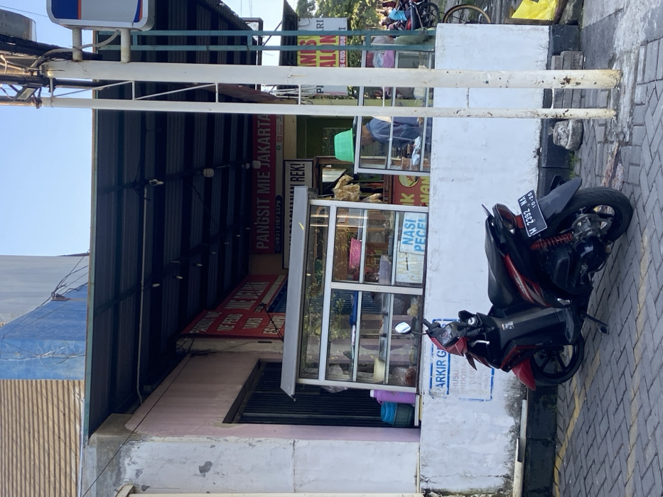 A street scene with a storefront advertising "Pangsit Mie Jakarta" and "Nasi Pecel