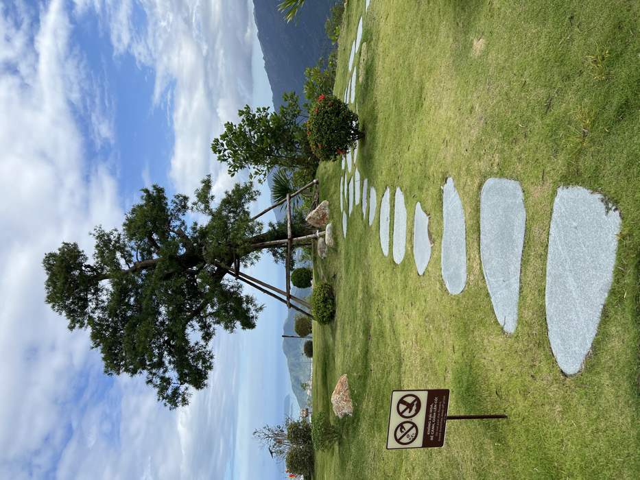 A grassy hillside path winds upward with large, flat stone steps. A tree with support structures stands to the side, with a distant mountain and sea visible in the background under a partly cloudy sky. A sign indicates prohibited activities, like damaging plants and walking on the grass. The scene is lush and vibrant, capturing a serene garden setting with a clear warning to preserve its beauty.