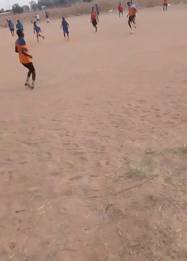 soccer game in progress on a dry, dusty field. The players are wearing different colored jerseys: blue, red, and orange. They are spread across the field, running and kicking the ball. The environment is arid, with sparse patches of grass and trees visible in the distance. The camera appears to be handheld, providing a ground-level perspective of the game. The sky is overcast.