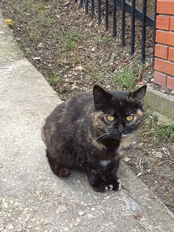 - "A tortoiseshell cat, primarily dark-furred with black, brown, and tan patches, sits on a grey concrete surface, looking directly forward with bright yellow eyes" by FM-71LUI2, licensed under CC BY 4.0