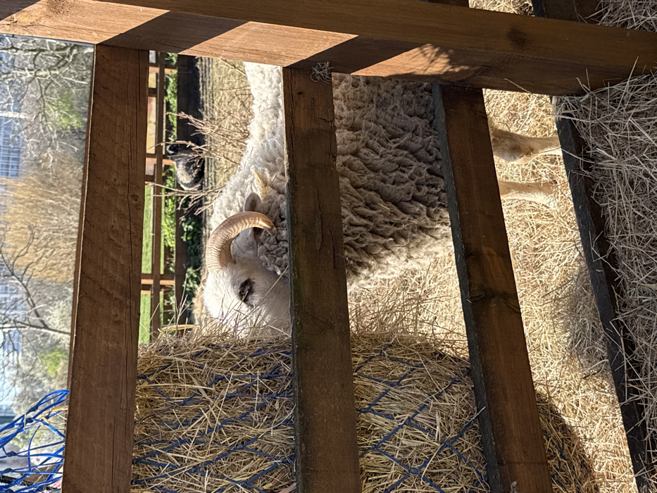 - "The image displays a white ram with curved horns, observed through a wooden fence, within an outdoor enclosure, likely an urban farm in London, United Kingdom" by FM-oH6mZ2, licensed under CC BY 4.0