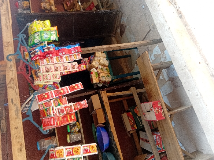 A small shop displays a variety of goods. Packaged drinks, sweets, and food items hang from clothing hangers. Below, shelves hold boxes, a blue bowl, and various containers. The shop appears to be constructed from wood and brick, with a simple, rustic design. Products are stacked and arranged to maximize the limited space.