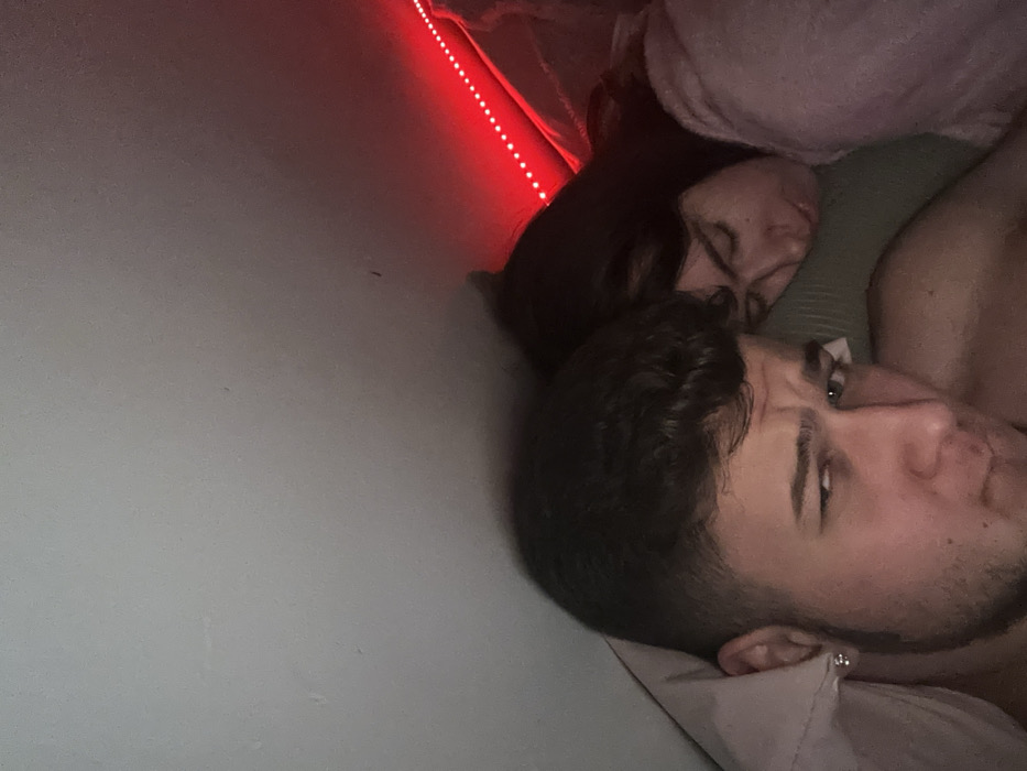 The image displays two individuals, one male and one female, in a dimly lit indoor setting in Corby, United Kingdom. The male, positioned in the foreground on the left, has short, dark, curly hair with faded sides, light facial stubble, and a silver stud earring in his left ear. He is partially covered by a light-colored pillow or blanket, appearing bare-chested, and looks directly at the camera with an alert expression. The female, situated behind and to the right of the male, has dark, long hair and is resting or asleep with her eyes closed. She is lying on her side on a dark green pillow and appears to be wearing a light-colored, possibly fluffy, garment. A red LED strip light is visible horizontally along the top right of the frame, illuminating the adjacent light-colored wall with a distinct red glow. The overall environment suggests a bedroom or sleeping area under low-light conditions.