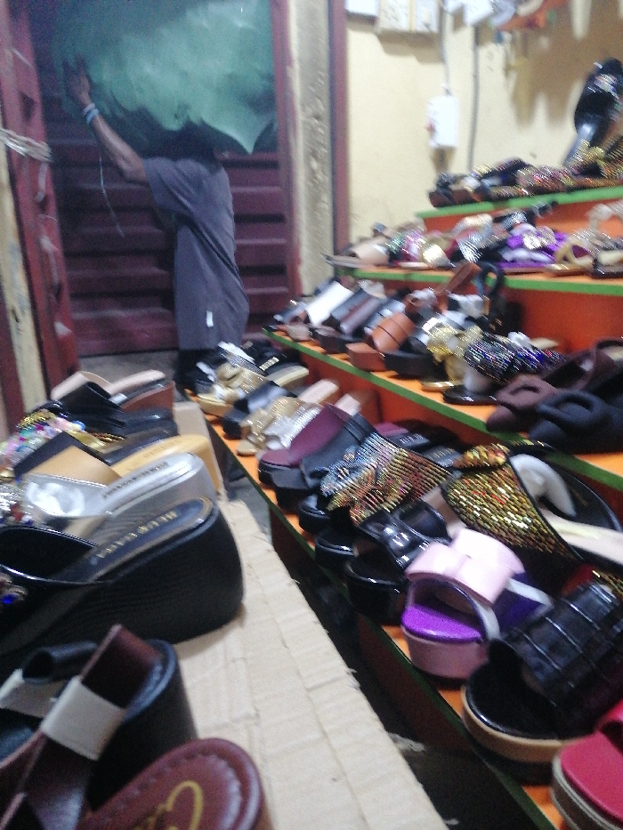A diverse collection of women's sandals fills the frame, arranged on tiered shelves. Many pairs feature embellishments such as rhinestones, glitter, and colorful straps. In the background, a man wearing a grey shirt is walking through a doorway carrying a green object on his head. The building has yellow walls and red and blue trim.