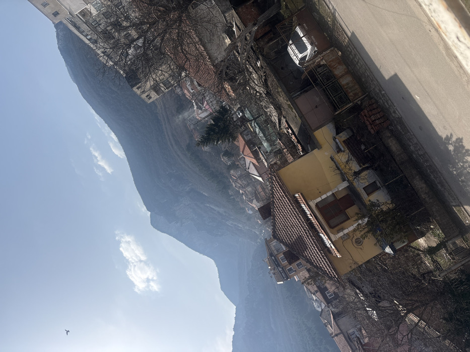 The image depicts an outdoor urban landscape in the city of Vratsa, Bulgaria, captured with a diagonal tilt where the left side of the frame is lower than the right. The scene is illuminated by bright daylight under a predominantly clear blue sky with sparse, wispy white clouds. A solitary dark bird is visible in flight in the upper left quadrant. In the background, a large, dark, forested mountain range with visible rocky outcrops dominates the horizon, appearing somewhat hazy. The midground is characterized by a dense residential area built into the foothills of the mountain. Numerous houses with orange and red tiled roofs are visible, interspersed with bare deciduous trees and some evergreens, suggesting a late winter or early spring season. To the far right, a multi-story apartment building with balconies is present. In the immediate foreground, a two-story yellow house with a prominent red tiled roof, a white-railed balcony, and a circular window on its lower facade stands. Adjacent to this house on the right, a small utility building or garage is visible, behind which a white sedan is partially parked within a fenced area featuring a rusted metal gate. Cyrillic text, "СГ СТРОЙ," is visible on a brown object near the car. A stack of reddish building materials, possibly bricks or tiles, rests near the yellow house. A paved road or street runs diagonally across the bottom of the frame, showing distinct shadows. No people or overt actions are discernible within the scene.