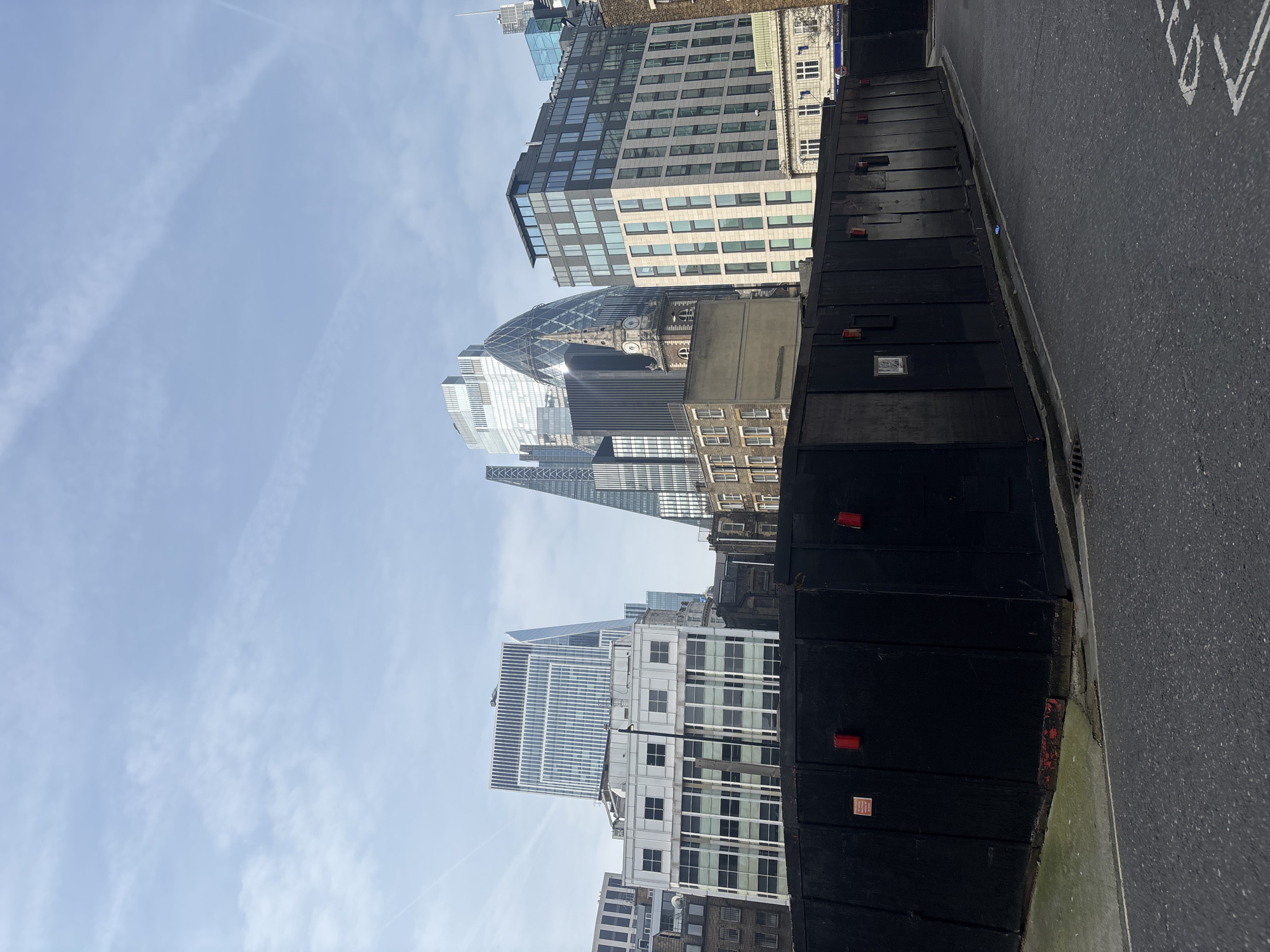 The image displays an urban street scene in the City of London, United Kingdom, under a light blue sky with scattered thin clouds and visible contrails