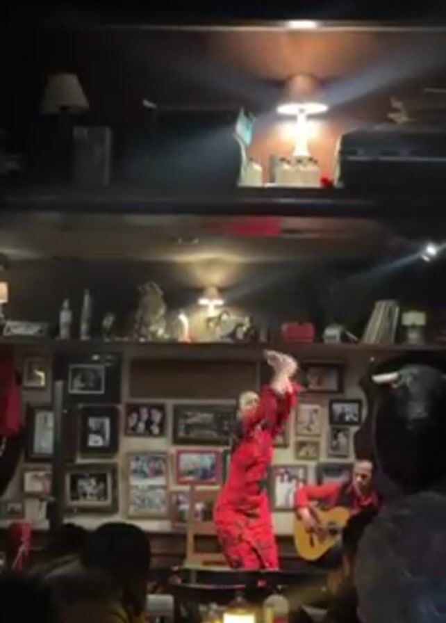 A woman in a red dress with black floral designs is performing flamenco. She is standing on a small stage in a bar or restaurant and dancing with dramatic hand motions. Her hair is long and dark, pulled back into a ponytail. Behind her is a man playing a guitar. The walls of the bar are dark wood, and adorned with framed pictures, decorative objects, and lamps. There are tables and chairs with customers seated in the foreground, some of whom are watching the performance. The lighting is dim and focused on the stage.