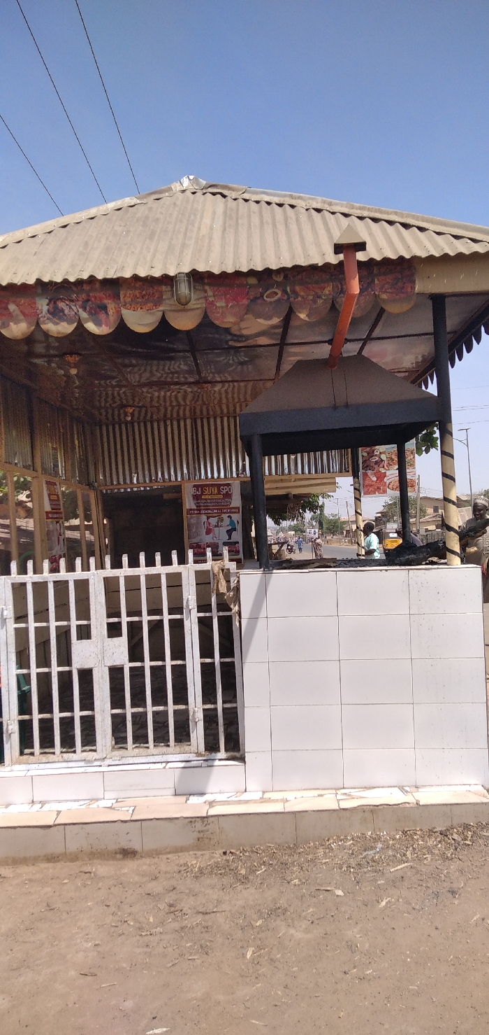 The image displays a roadside food establishment, identified by a prominent sign reading "BJ SUYA SPO," located in Unguwar Gabas, Nigeria