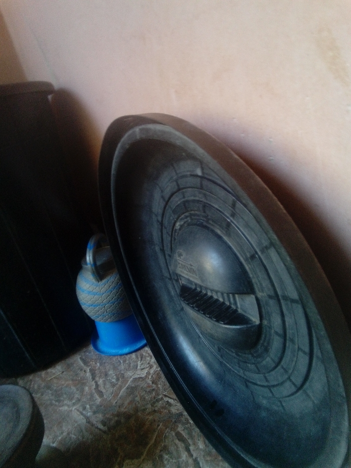 The image displays an indoor scene in Rangaza, Nigeria. A large, dark grey vehicle tire is positioned prominently in the foreground, leaning against a light peach-colored wall. The tire exhibits a distinct tread pattern and features the brand name "ZENITH" on its sidewall. To the left, a partial view of a second dark, cylindrical object, consistent with another tire, is visible. Between these two large objects, a light-colored, possibly woven or patterned, spherical item rests on a bright blue conical base. The floor is covered with dark brown and beige marbled tiles. A section of a flat, circular, light-colored object is partially visible on the floor in the bottom-left corner. No individuals are present, and no specific actions or interactions are depicted.