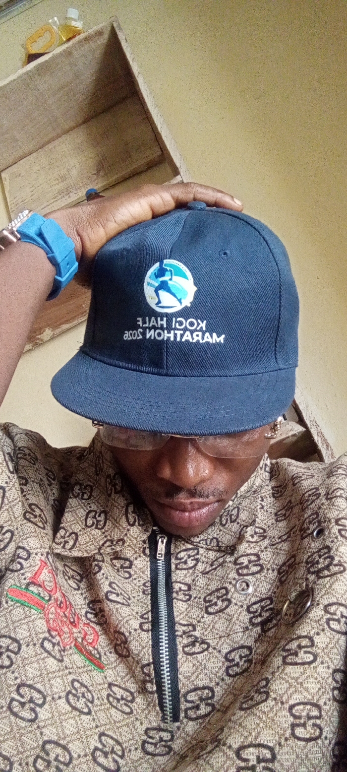 A dark-skinned male is depicted in a close-up, chest-up shot within an interior setting in Adankolo, Nigeria. He is wearing a navy blue baseball cap with a flat brim, featuring a mirrored logo that reads "KOCI HALF" and "2023 MARATHON JOS" alongside a runner silhouette. His right hand rests on the crown of the cap. He wears clear-lensed glasses with thin frames and a light brown patterned shirt with a partial black zipper and a red and green embroidered design on the left chest. A thin gold-colored chain is visible around his neck. On his left wrist, a blue silicone strap or watch band is visible, with a metallic, possibly rose gold, watch or bracelet beneath it. The individual's head is tilted downwards, and he is looking away from the camera. The background consists of a light yellow wall and a rustic wooden shelf or crate in the upper left, holding two small clear bottles containing yellow liquid. One bottle contains a small, light-brown object.