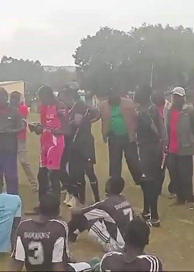 group of people on a grass field, likely a sports field, as indicated by a soccer goal in the background. A group of young men in soccer uniforms are sitting on the grass, while another group of adult men stand in a semi-circle, some holding what appear to be small electronic devices. Two men in uniform, one in what looks like a military uniform and another in a blue uniform, are standing on the periphery with rifles slung over their shoulders. Trees surround the field and a building is visible in the background. The overall atmosphere seems calm, with people talking and interacting, suggesting a post-game or pre-game discussion or meeting.