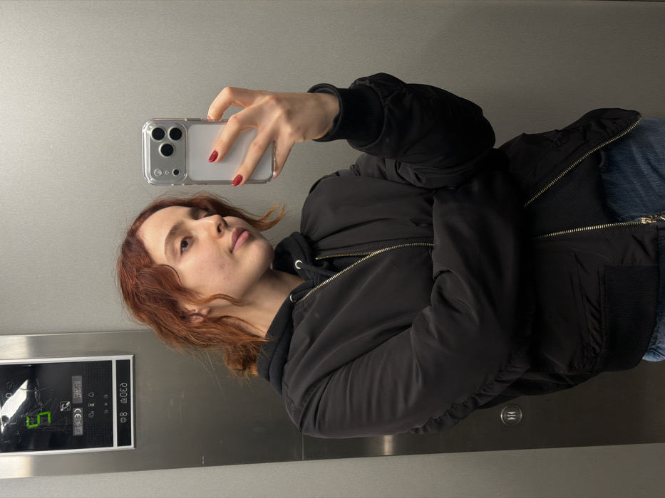 A young woman with auburn hair takes a selfie in an elevator. She holds a smartphone with a clear case and red nail polish is visible. She wears a black bomber jacket over a hooded sweatshirt. The elevator has a digital display and a metal panel with the accessibility symbol. The background is primarily a gray metal wall.