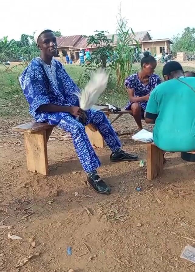 The scene shows three people sitting on wooden benches outdoors. The person on the left is a man wearing a blue and white patterned suit and black shoes. He is holding a white object that looks like a whisk. The person in the middle is a woman wearing a blue and purple patterned dress. The person on the right is wearing a green shirt and is sitting with their back to the camera. There are papers on the bench in front of them. The ground is dirt and there is litter scattered around. In the background, there are buildings and trees. The sky is overcast.
