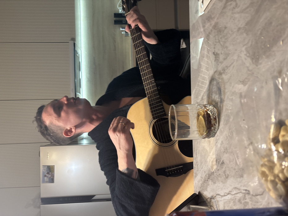 The image depicts a male individual in an indoor residential setting, identified as the city of Нестюково, Russia. The man, approximately in his late 20s to early 30s with short, dark hair, is positioned in what appears to be a kitchen or dining area, actively playing a light-wood acoustic guitar. He is wearing a dark, possibly navy blue, textured robe, open at the chest, and has a ring on his left ring finger. His mouth is open, suggesting he is singing or speaking. His left hand is on the guitar's fretboard, while his right hand is positioned over the soundhole area. In the immediate foreground, on a light grey, marbled countertop, rests a faceted glass tumbler containing a dark amber liquid with multiple yellow citrus slices. To the left of the glass, a partial view of a clear plastic bag filled with light-colored nuts is visible. The background features a modern kitchen environment, including a white, two-door refrigerator with a small picture magnet on its left door, and light-colored, vertically grooved kitchen cabinets extending across the upper portion of the scene. An under-cabinet light strip illuminates the area beneath the cabinets.