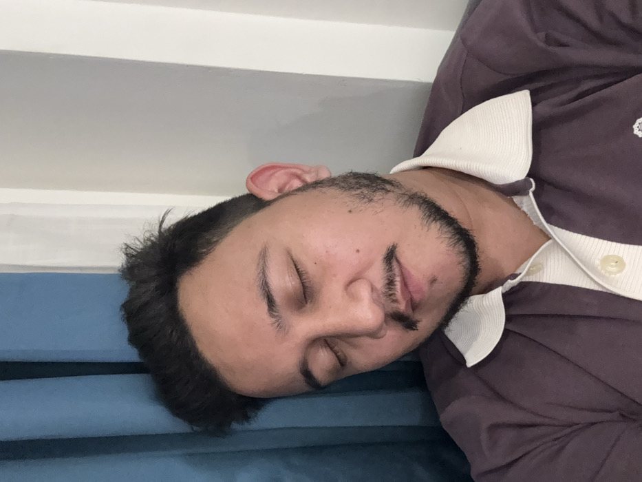 A person with dark hair and a beard is lying down. Their eyes are closed and their face is turned to the side. They are wearing a purple and white striped shirt. The person is lying on a blue surface. The background includes a white wall.