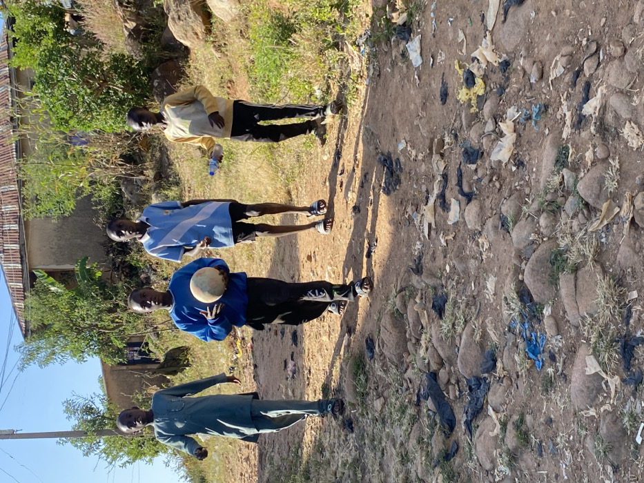 Four young males are observed walking on an unpaved, debris-strewn dirt path in the city of Gwong, Nigeria, under bright daylight
